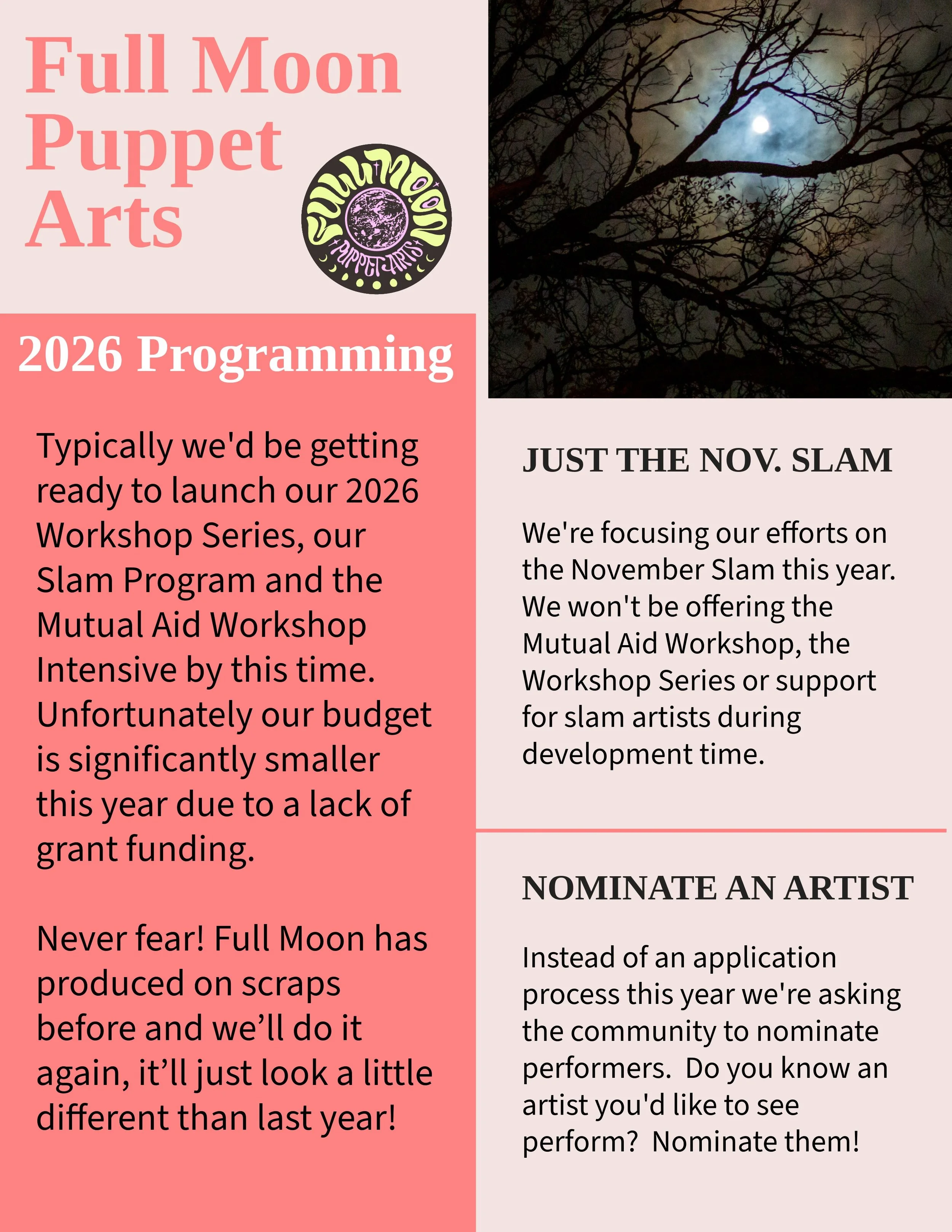 Howl at the moon and enjoy 10-min original puppet shows. Join us under the full moon for an adult, rowdy puppet slam Nov. 12, 13 & 14! Featuring performances by some of the most innovative Twin Cities puppetry artists with live music between acts. All reservations are done through Open Eye Theatre’s website and will become available for purchase in October 2026.