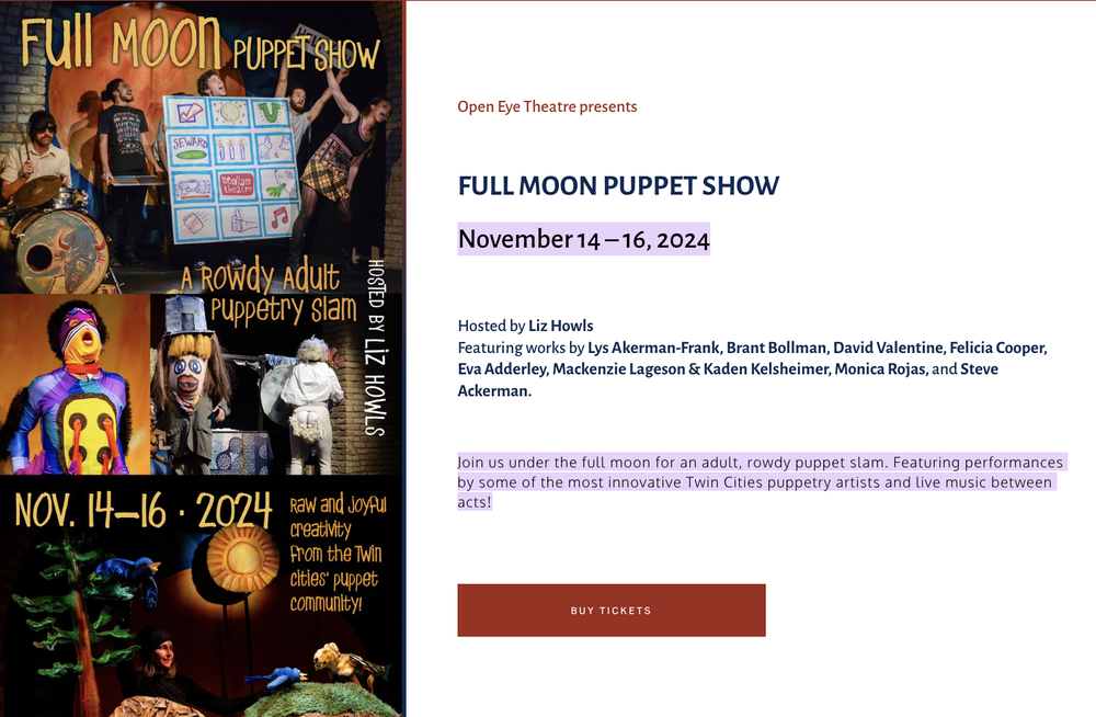 — Kris Moua (Slam Lead Artist)“As an emerging puppet artist, this opportunity provided space for me to stretch my imagination, grow skills, have place to practice and play and gave me such pride when the performance finally came. Thank you Fullmoon!”
