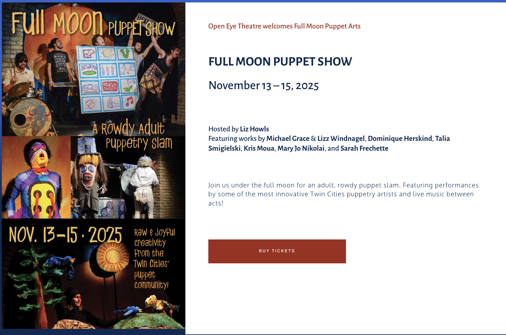 — Talia Smigielski (Slam Lead Artist)“I learned a lot from the resourceful production team and my cohort. Full Moon is the perfect incubator for emerging puppeteers and artists who want to experiment with puppetry.”